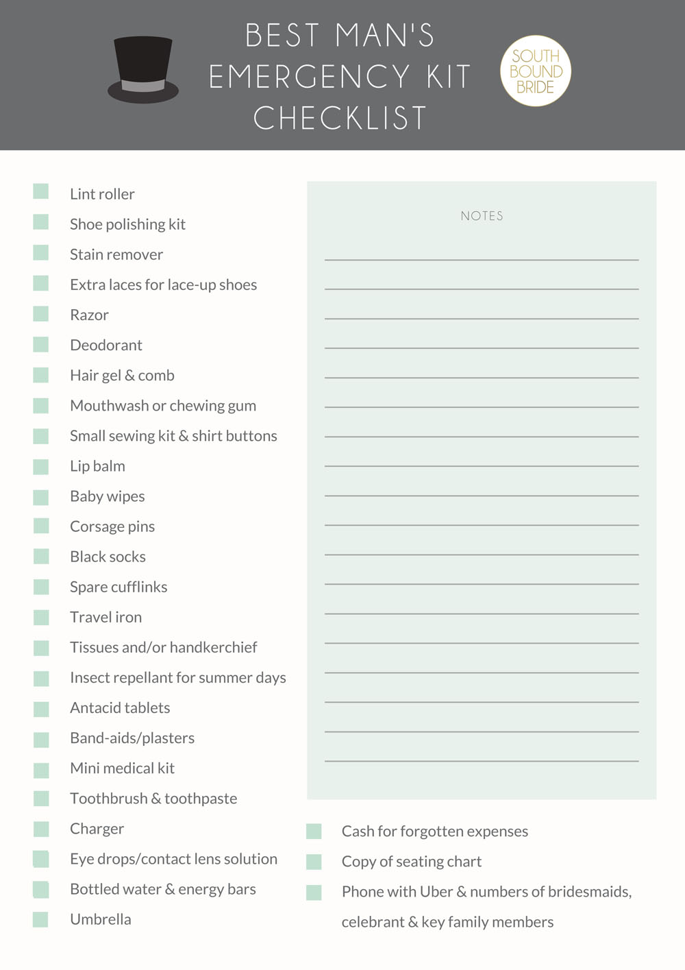 A few weeks back, we heard from planner extraordinaire Theresa of Creation Events with her top tips & duties for groomsmen, following the popular feature we did for bridemaids. So useful to have everything summed up in one place for the boys! So today I thought that I would follow it up with some more groomsman goodness – a best man’s emergency kit (download our bridesmaid’s one here). So here we go – let’s hear it for the boys! *Links in bold denote affiliate links – SBB may receive a commission on any sales made.