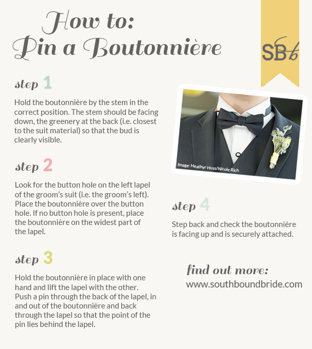 Happy Friday, friends! You know, in my years as a wedding blogger, many’s the time I’ve come across pictures of a hapless groom waiting for his bride at the altar, boutonnière akimbo. Bless them. By the time we’re at the couple shoot, that lil’ bout has always been rearranged. Now, whether your groom’s buttonhole is up, down or sideways is the absolute least important thing going on during your wedding ceremony. But to help the guys out (and save you having to fix it later), here’s a quick and simple SBB guide to pinning the boutonnière. You’re welcome, gents! PS Did you know that the tradition for pin corsages (aka the ladies’ equivalent of a boutonniere) is to be worn on the opposite (wearer’s right) side and with the stem facing up?