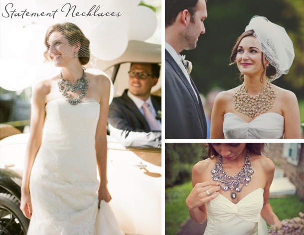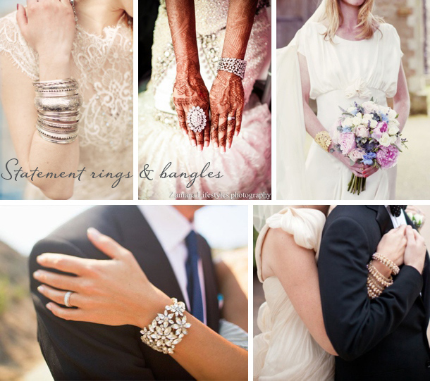 - Don’t limit yourself to just necklace or earring ideas either – bracelets are BIG news in bridal next season, and I love seeing brides in fabulous cocktail rings (a great option if your dress has a lot of sparkle already).