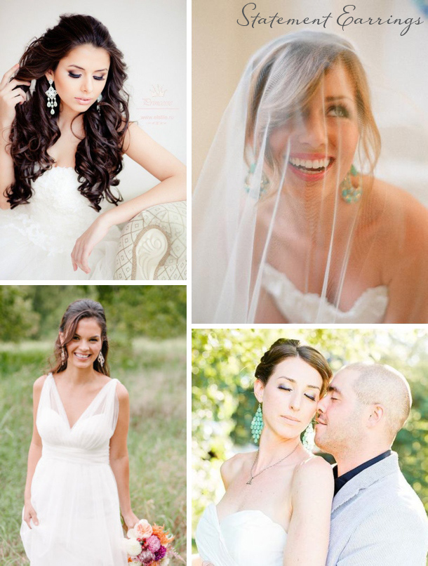 As I mentioned before, the key to statement jewellery is not to go overboard. In general, I’d advise picking a single statement piece, and allowing it to speak for itself. That said, I have seen brides rock more than one – maybe a set of sparkly earrings right next to a sparkly headpiece, or perhaps a bracelet as well as a pair of earrings. As I say, it can work, but to be on the safe side, stick to just the one. And you definitely don’t want to go necklace + earrings, as they’ll not only completely overwhelm each other, but they’ll overshadow your dress as well.