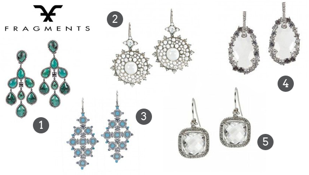 1: Emerald chandelier earrings; 2: White sapphire bullseye earrings; 3: Mist Ravenna drop earrings; 4: Pear cluster earrings; 5: Sparkly cushion drop earrings