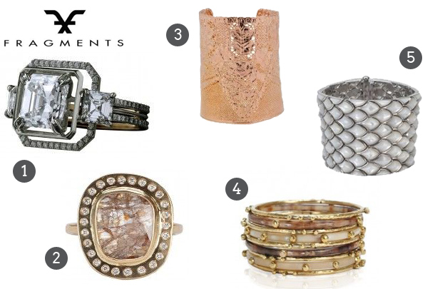 1: Three stone Asscher cut diamond ring; 2: Rutilated diamond halo ring; 3: Golden Pauline cuff; 4: Shaba bangle set light horn; 5: Mother of pearl scale cuff
