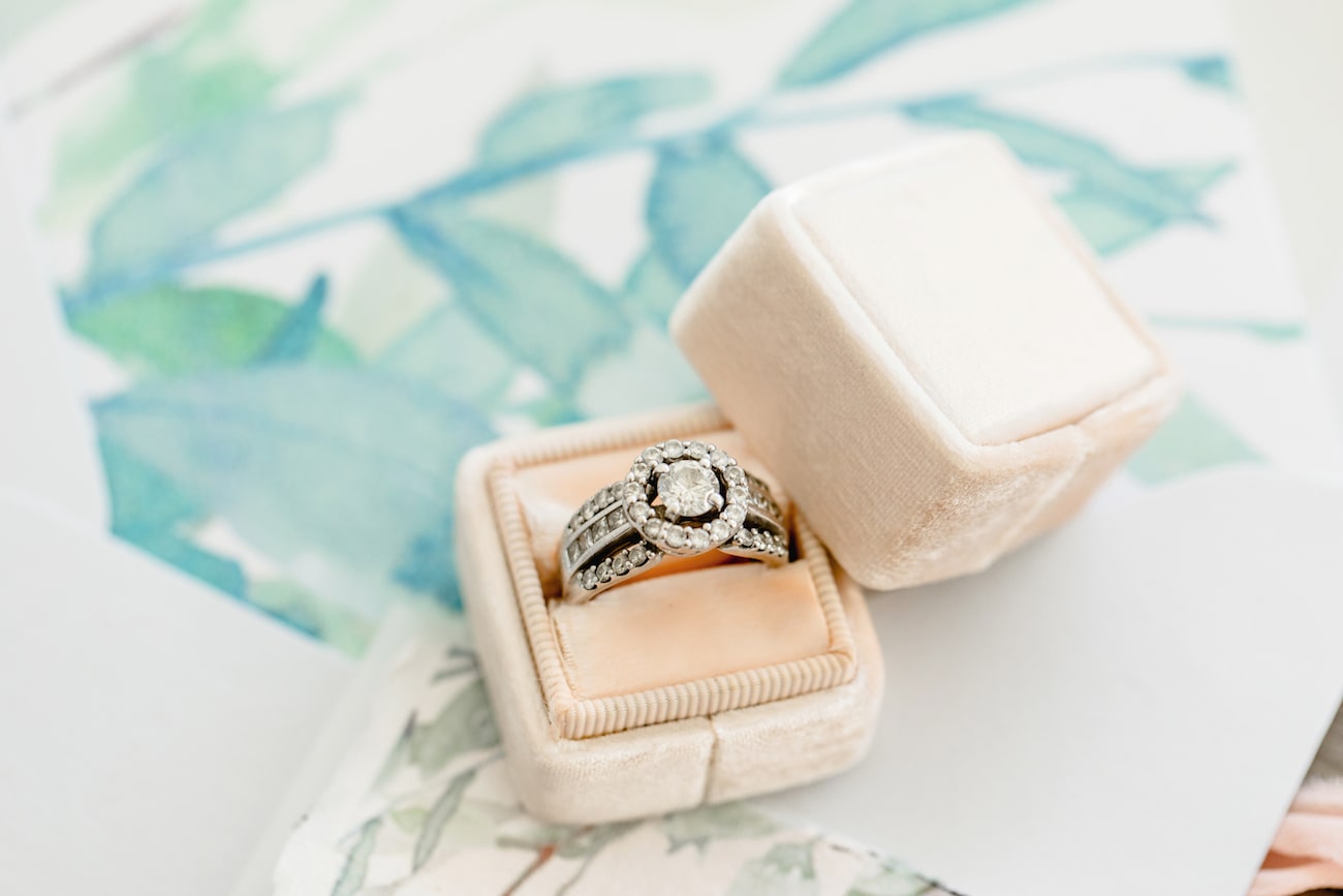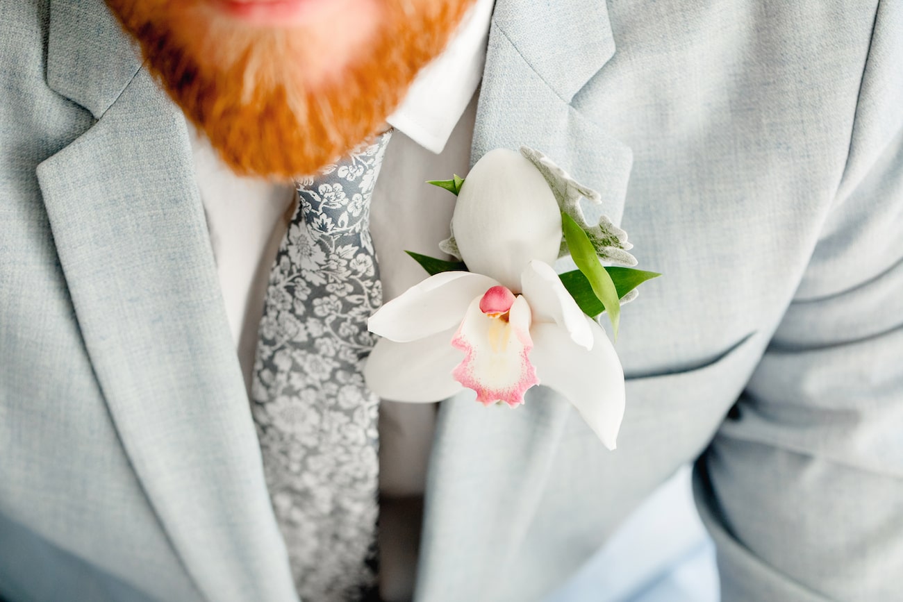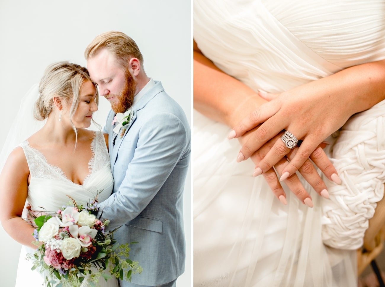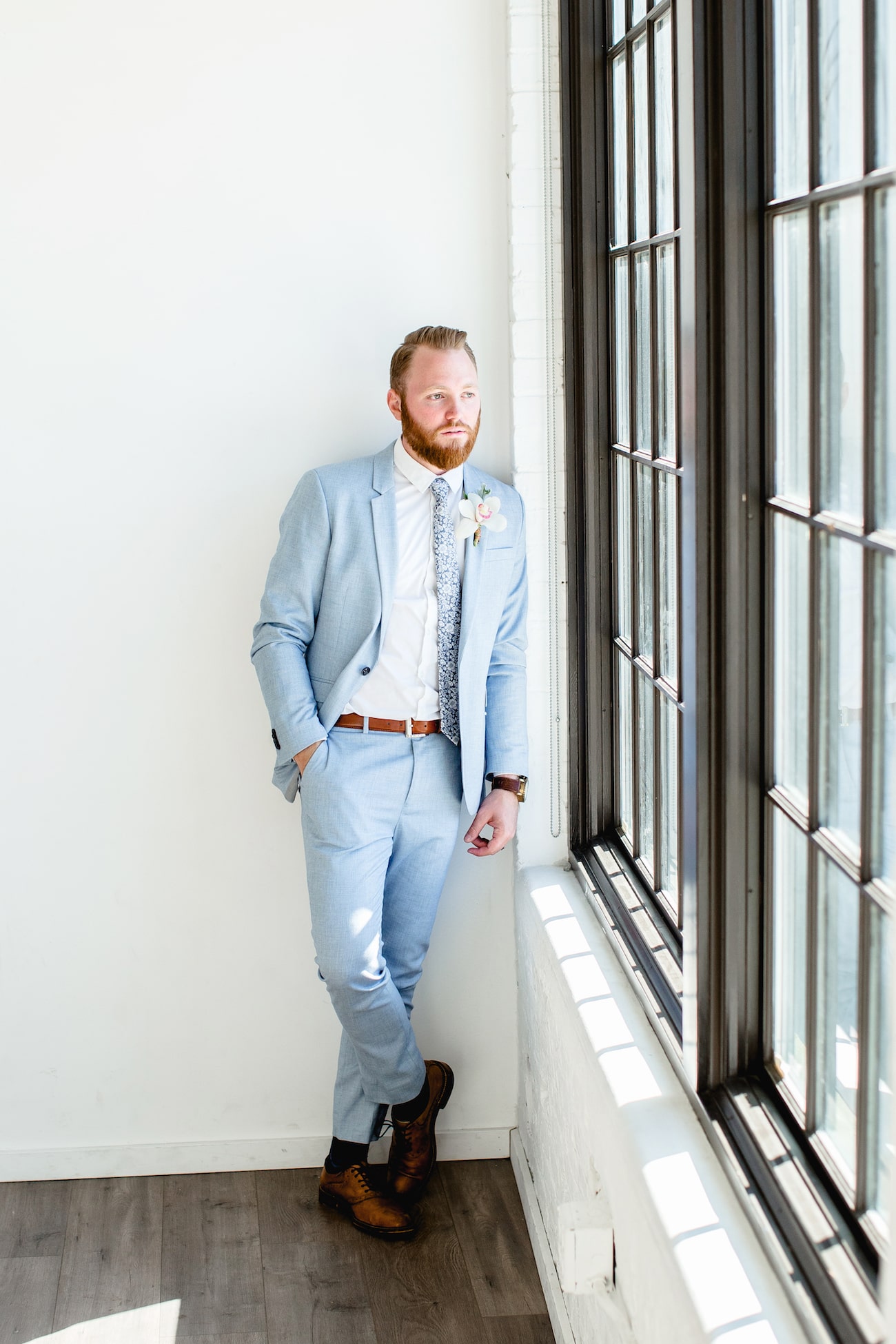 Our inspiration was based around the suit that our groom already owned (seriously, what a cool guy to own such a unique suit! He credits that to his wife!) We then pulled in other pastel elements that would still be able to pop with soft and airy photos. For our bride, we desired a soft, airy fabric so that her groom could spin her around the room and romantically dip her. Her veil even included soft pearl pink details which was carried through the rest of the gallery. The perfect early autumn day provided ideal natural light and even allowed us to play with shadows. We really decided to focus on the couple and their loving interaction!