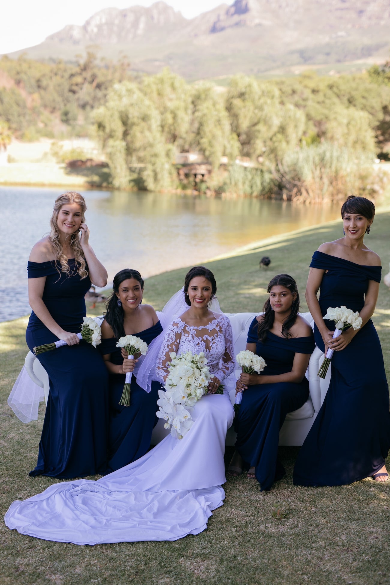 My four bridesmaids wore dresses that were elegant and simple, off-the-shoulder navy fitted dresses.