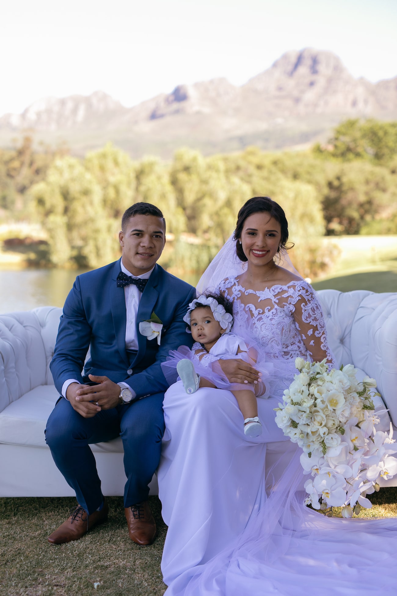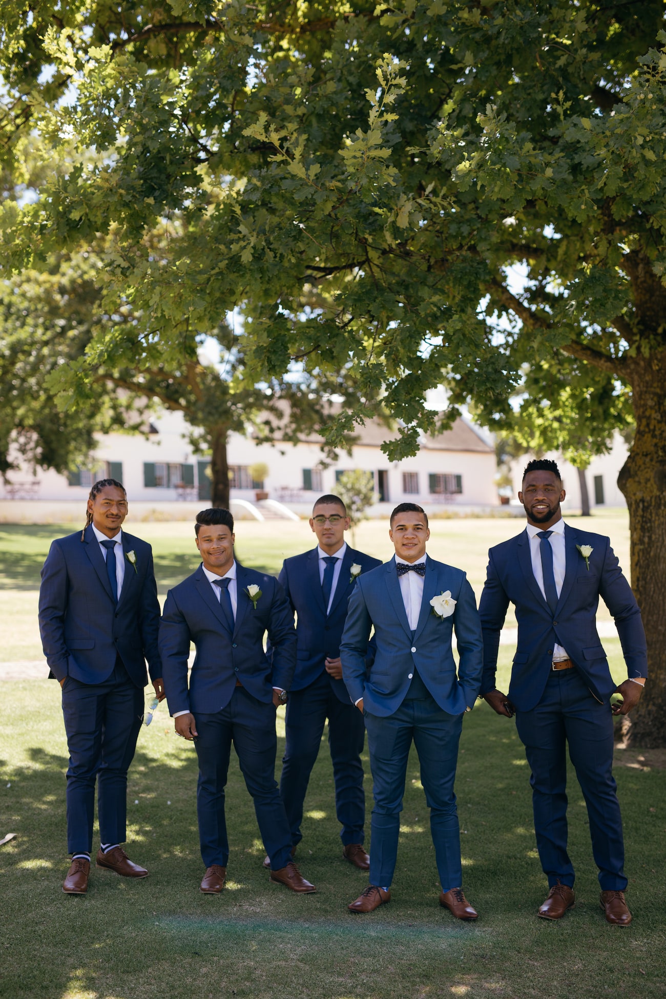 I don’t feature a lot of ‘celebrity’ weddings here on SBB – in general, I prefer to tell the stories of real people on the happiest day of their lives. But of course, celebrities are real people too, with their own real, beautiful love stories, and some of their weddings aren’t about the glitz and the glam and the feature on Top Billing, but rather the incredible joy of two people promising their lives to one another. So while you may recognise Cheslin Kolbe from his time at Western Province or as part of our Olympic medal-winning Sevens team, or most recently as a Springbok (yay!), you’ll really fall in love with his wedding to beautiful wife, Layla. I’ve been holding on to this wedding for a while to share with you this week, and I’m so excited to finally let it make its SBB debut! It’s classic, it’s elegant, and most of all it’s heartfelt. I defy anyone to watch the video and not get a little choked up when Cheslin does, as Layla walks down the aisle, or to grin along with them post ceremony – they both look happier than a man raising the William Webb Ellis. Also, I’m not gonna lie, there are some hot groom’s party images in here that you do not want to miss, since Cheslin was joined by (among others), our Springbok captain Siya Kolisi (along with his wife, Rachel, as a bridesmaid). What do you call a bunch of fit, shirtless rugby players in a swimming pool? A good day at work for Gaby, that’s what. Some of the other details we loved include Layla’s incredible Robyn Roberts gown, the timeless winelands setting, the fun cake topper, and of course, Layla and Cheslin’s sweet daughter as the most adorable flower girl ever! Huge congrats to the Kolbes, and to Lavender Creations for pulling off such a gorgeous event, perfectly captured by Duane Smith Photography.