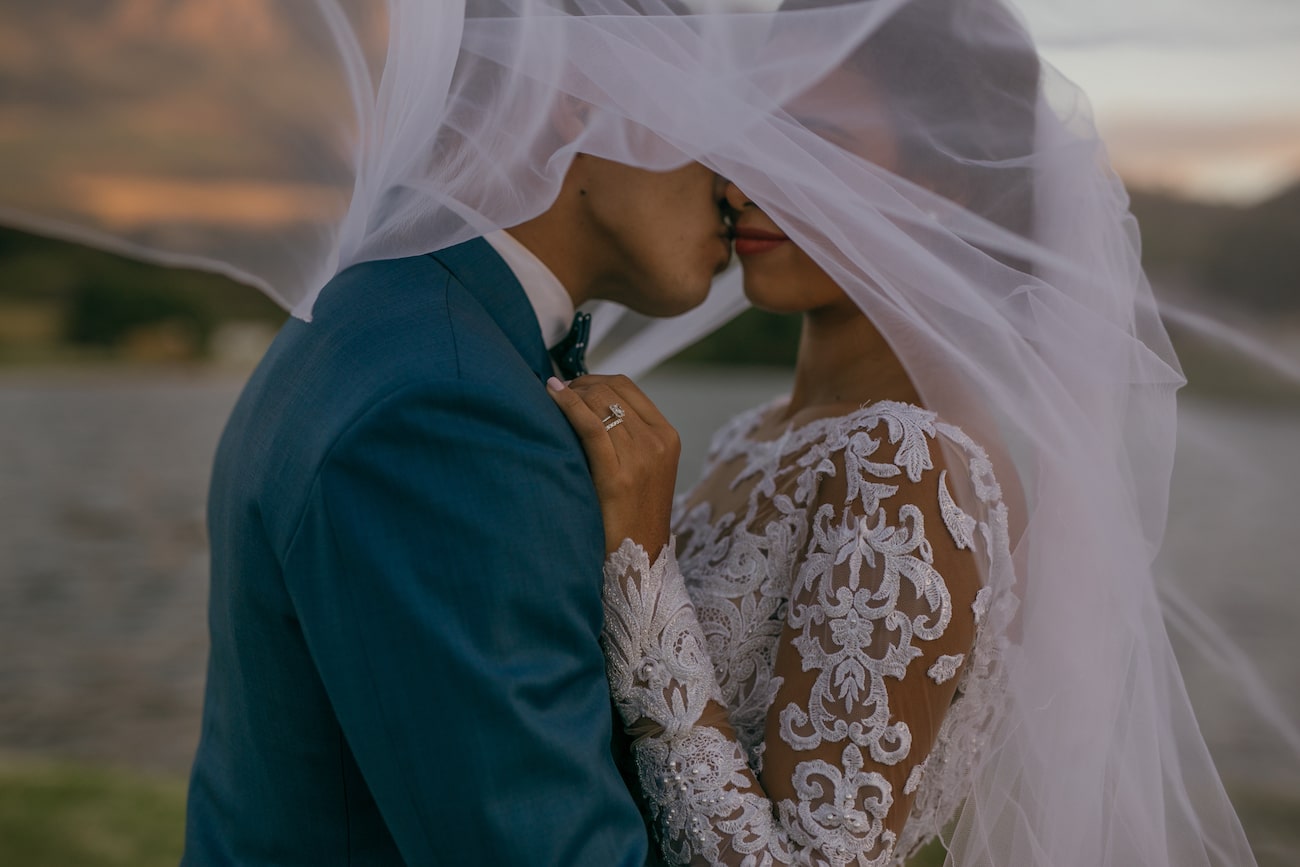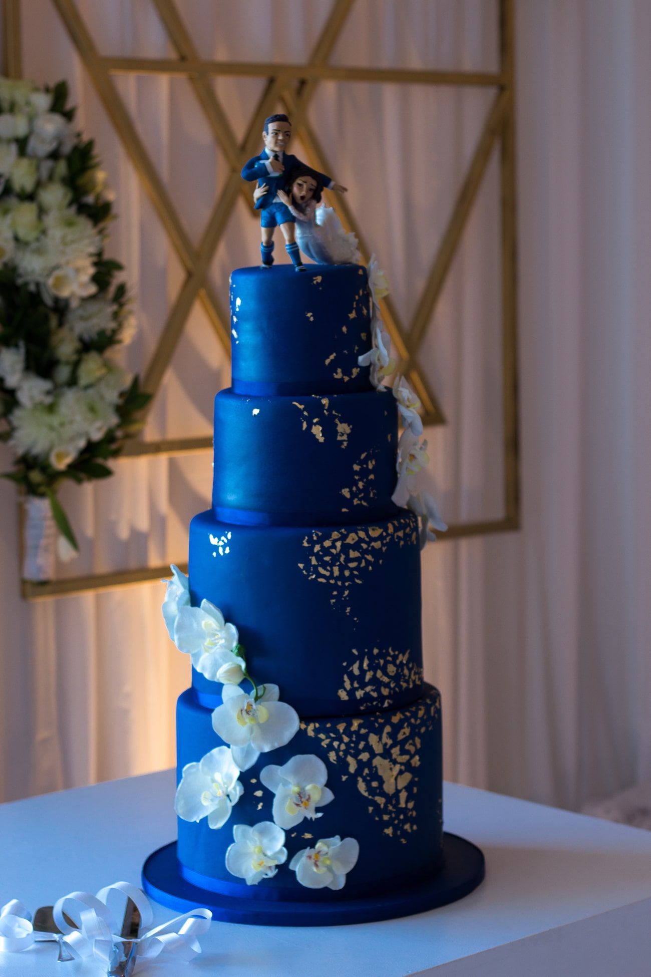 I walked down the aisle with my dad to the song ‘The Prayer’ by Celine Dion, a live duet sung by Vernice Platje and Danelle Lewin from our church (Hillsong church in Cape Town). The lyrics of that song are so special to us, as it is a prayer for our marriage. I wanted our wedding cake to stand out amongst the white and that’s why we opted for an unconventional navy blue four-tier wedding cake with gold printed leafing and orchids flowing down, and a personalised hand-made topper figurine of Cheslin running with a rugby ball and myself catching him/falling for him- depicting our love story. Later in the evening, we were surprised by fire dancers across the dam, where guests were asked to gather outside as we watched the thrilling yet awesome performance.