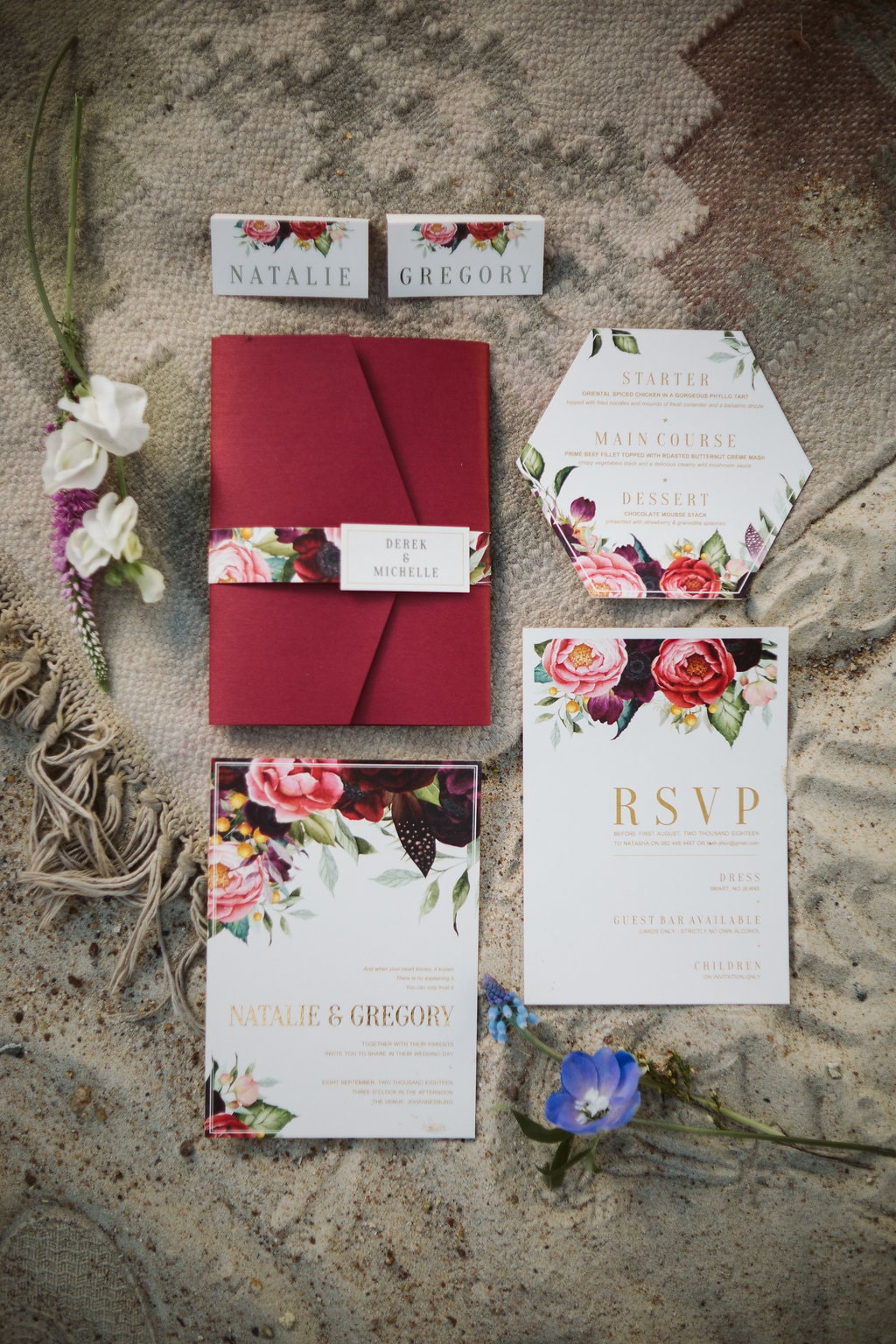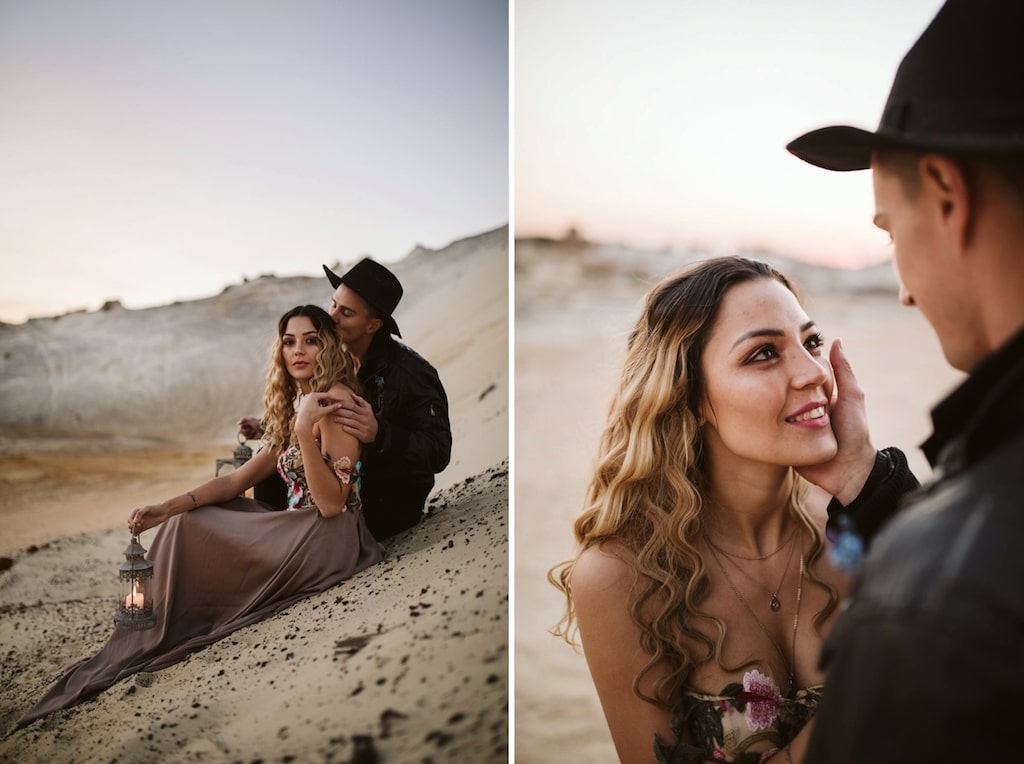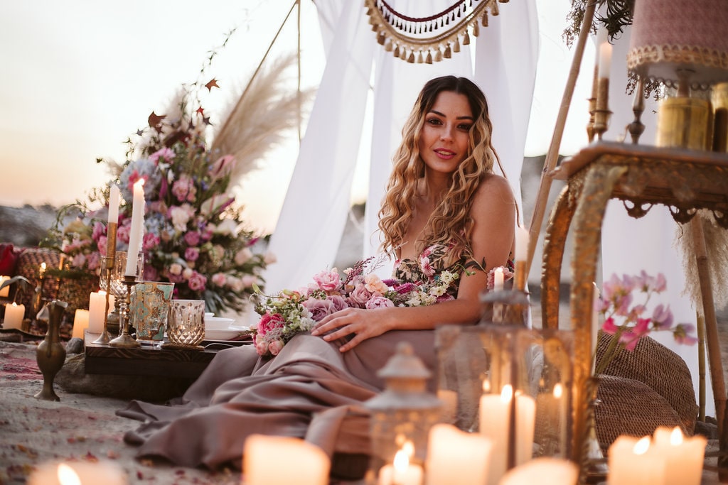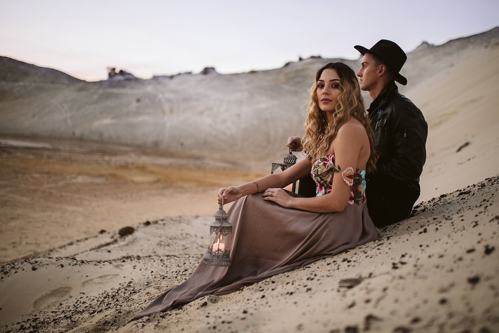 Not many South Africans explore the opportunity to set up camp in an open location to create the wedding of their dreams. We wanted to show how easy and attainable this actually is. Within two hours we had set up the perfect little elopement area with only four people working on it. It really is a great idea to find the perfect spot, and ask your vendors to come to you for your own custom setup! Since the sand dune at the location looks very desert-like, we decided to theme the shoot around the concept of the Nomad – ever-changing, ever-moving. A lot of young couples these days want something unique for their wedding. They want to create special photographs of their nuptials that no one else has. Overall, it was an incredible day with a lot of firsts (letting off those smoke grenades was terrifying for second shooter, Leigh Benson!), bumps on the head (second shooter Roxanne Roerink eventually had to stand holding the bamboo structure for over an hour in the hot sun, until the flowers were fully assembled, so that it didn’t blow over!). Not to mention, since it was a mine in Africa, we had CORTAC security as our own personal security detail – we felt like such VIPs!