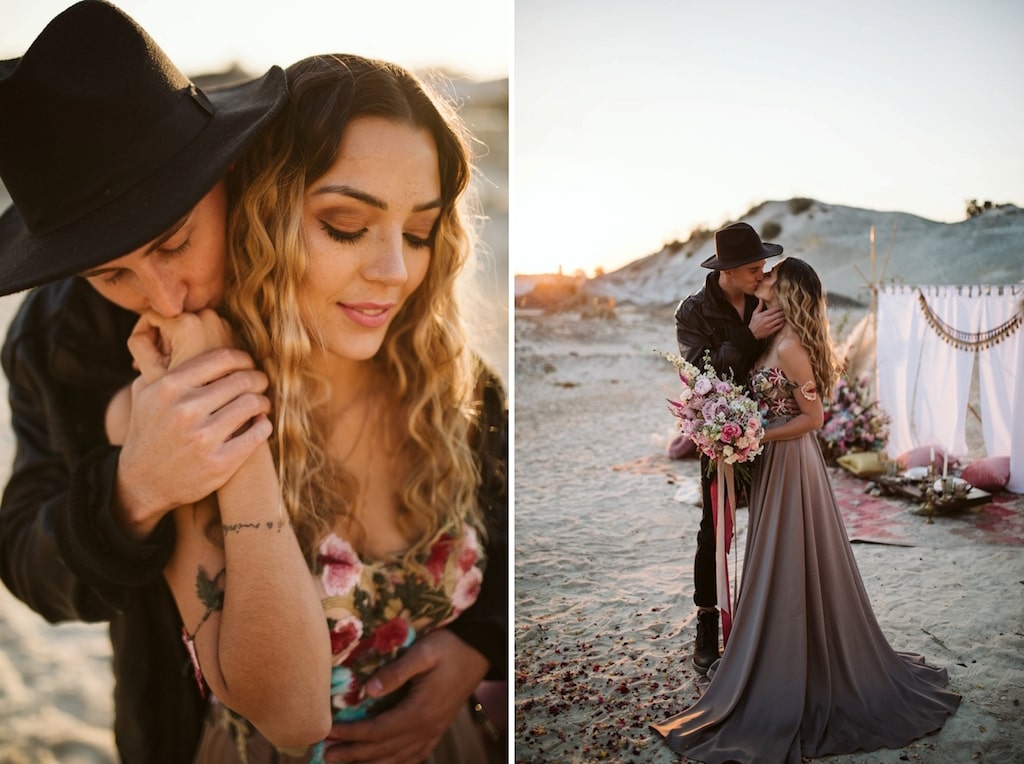 Happy 2019, lovely ones! And a huge big special welcome to all of you who are just engaged and joining us on SBB for the first time! We’re kicking off the year with some gorgeous modern boho inspiration with a desert vibe, brought to life by a talented local team. (Start as you mean to go on, I say!) I especially love that this one is an elopement, because styled elopements have become one of my absolute faves recently – I just adore the idea of escaping with your ride or die to the dunes and having a dreamy picnic while the sun goes down, perfectly captured by a photographer like the lovely Jessica Notelo! It also shows you don’t have to go to Morocco or the Mojave to capture this very much on-trend desert style. And OMG you guys the details! Cake, dress, flowers, oh my! Let’s get inspired, shall we?