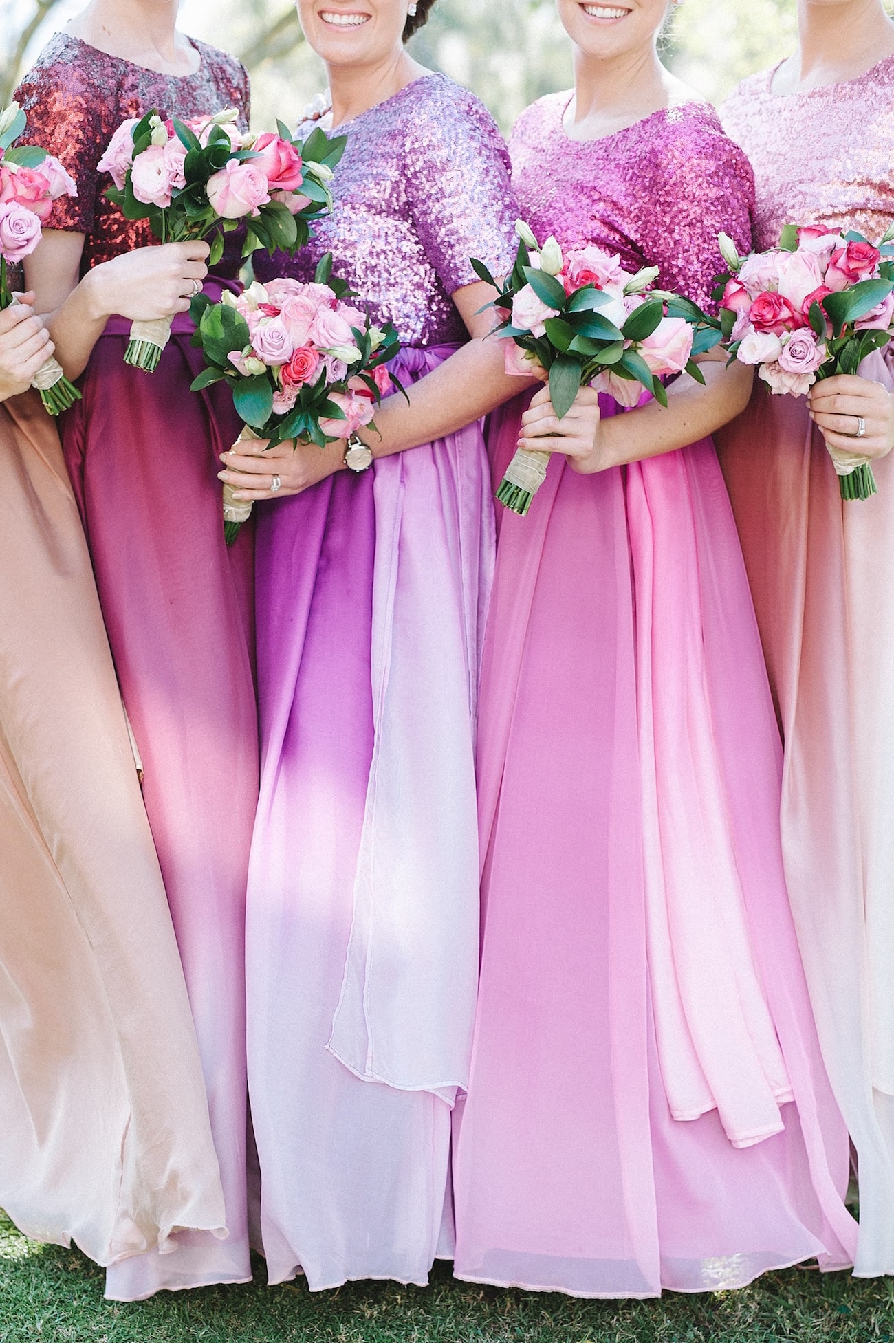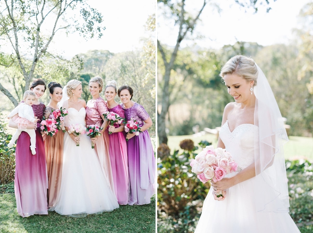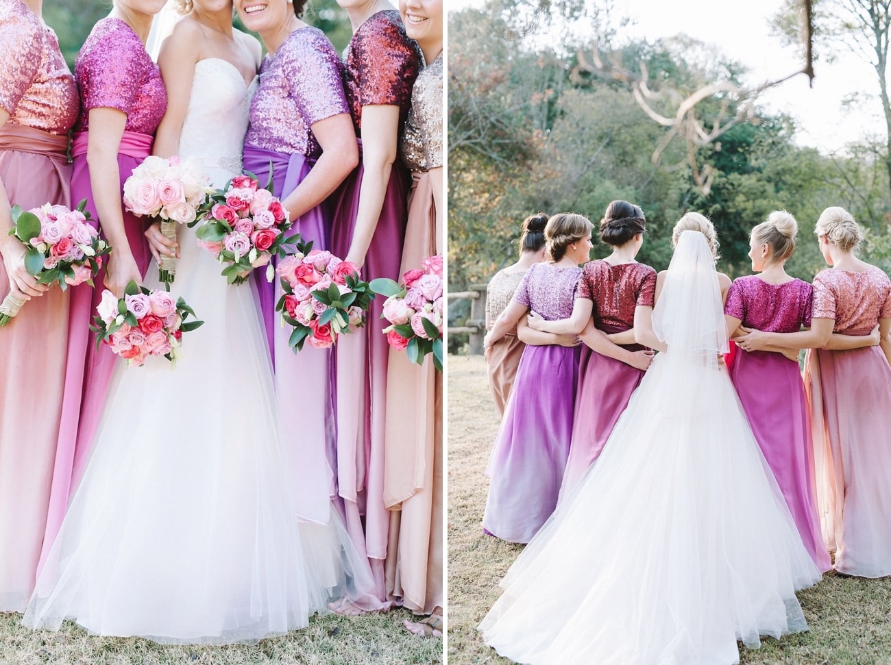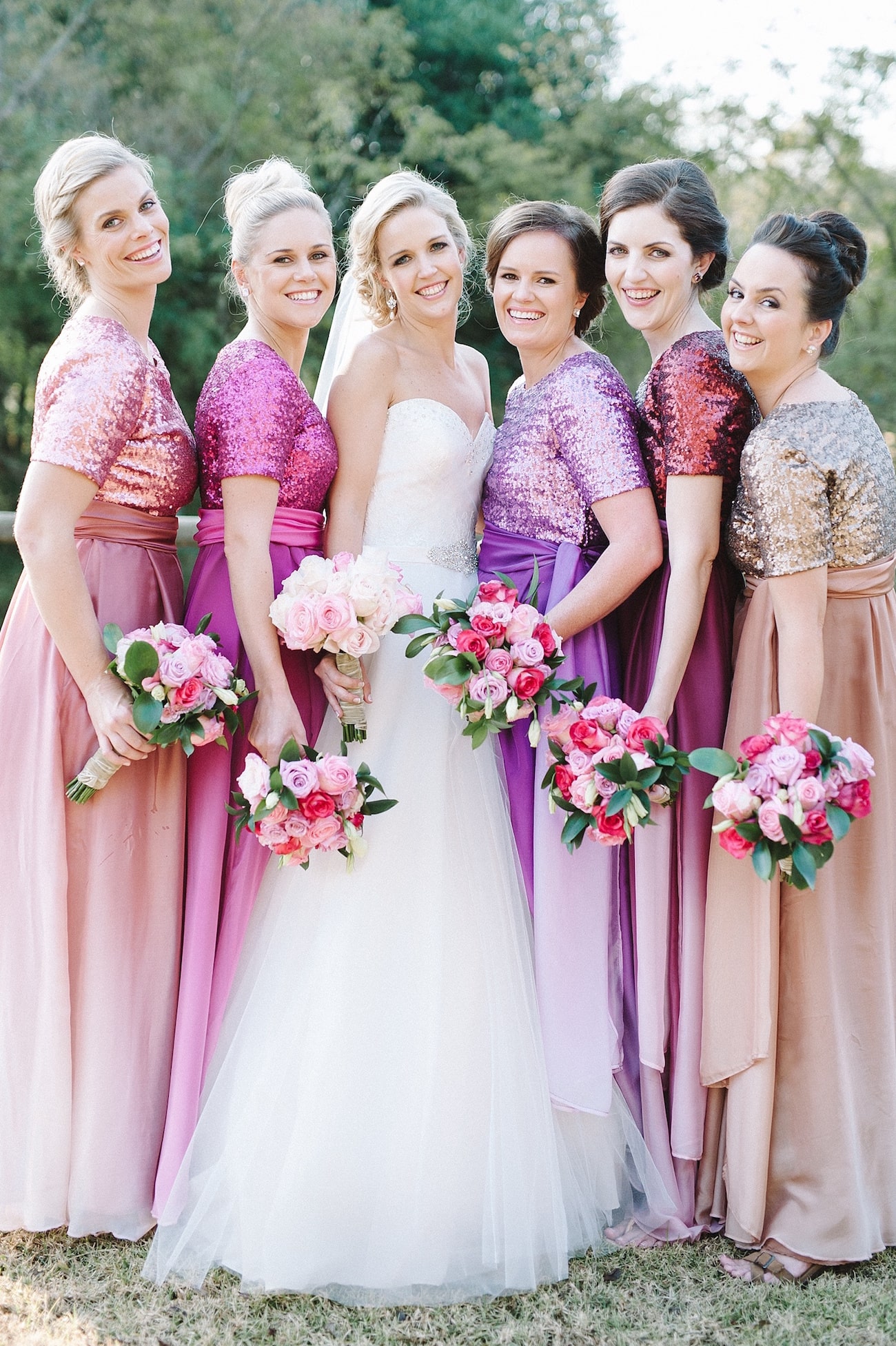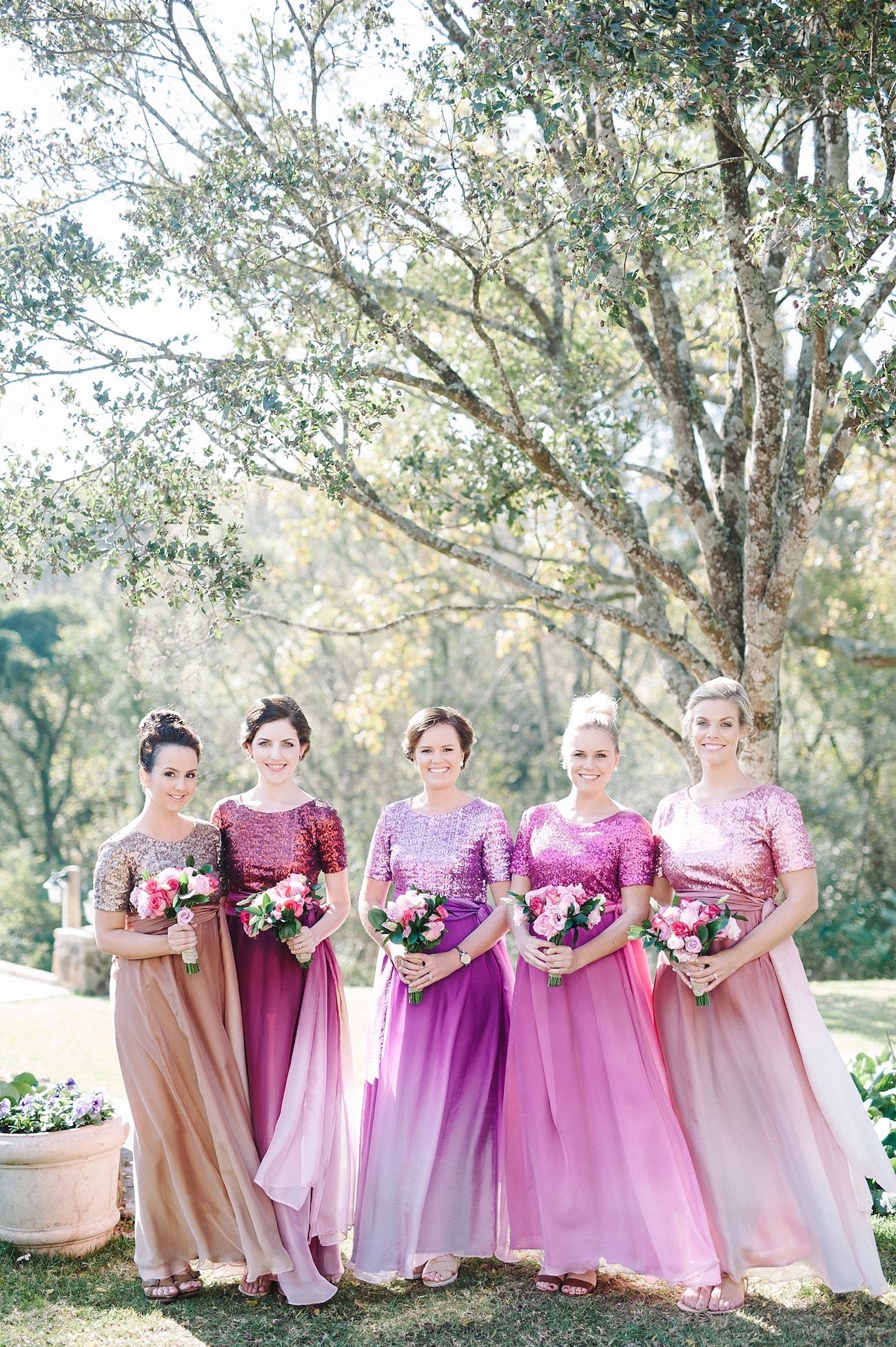 My five gorgeous bridesmaids and their dresses really set the style for our wedding day. I found a picture of the style I wanted, and my very generous, clever and brave step-mom offered to make them for us. Because the colours were bold, we chose the colours specifically to suit each bridesmaid. I absolutely loved their dresses. My girls looked incredibly beautiful.